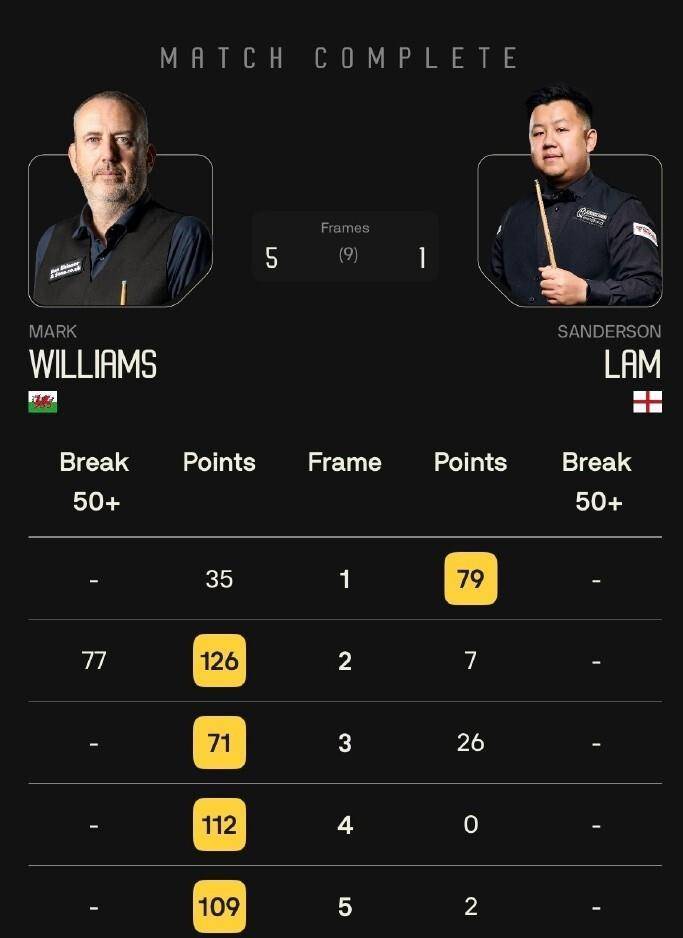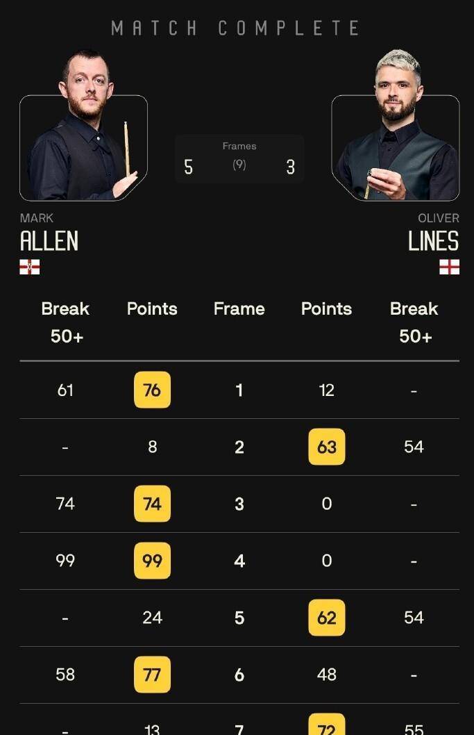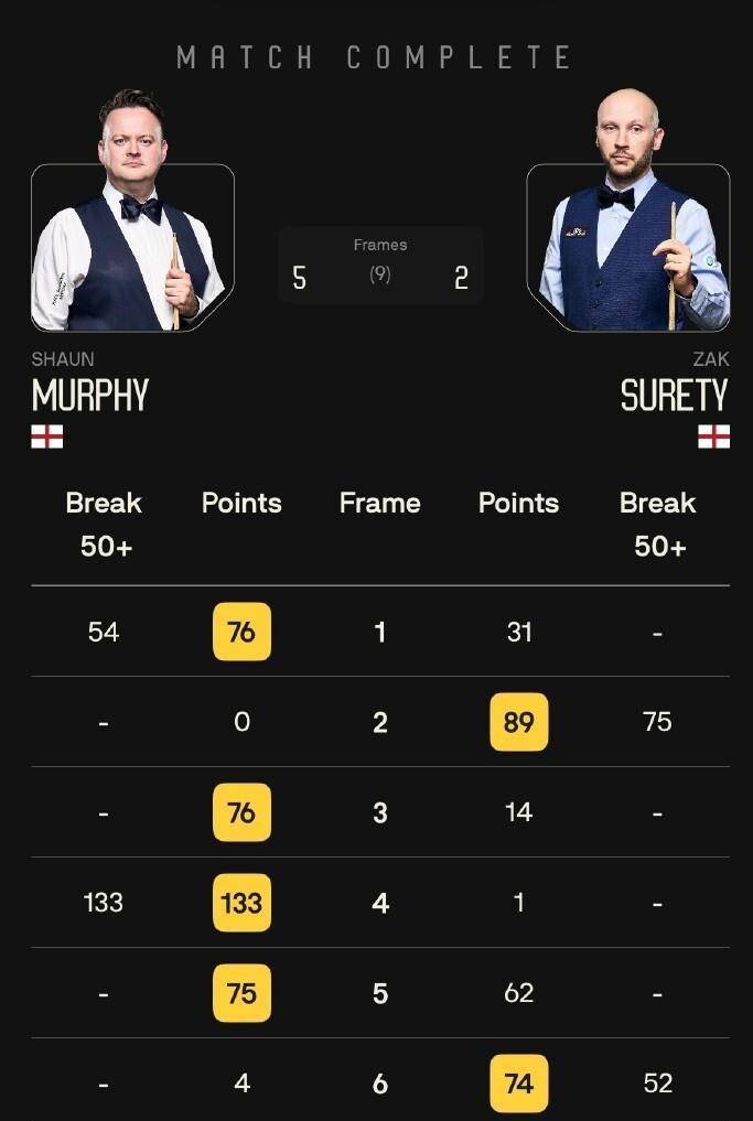 艾伦和墨菲也都没掉链子。 艾伦轰出五杆50 ,包括一杆99分,和莱恩斯缠斗八局后5-3胜出;墨菲则打出一杆133分破百,5-2轻取舒尔第。 倒是威廉姆斯赢得有点磕绊,全场就一杆77分,但靠经验连赢五局,5-1逆转林杉峰。