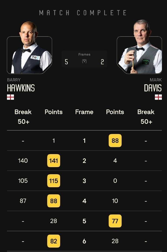 霍金斯这头更猛,轰出单杆140分当前赛会最高分,外加一杆105破百,5-2淘汰老将马克·戴维斯。 这140分说不定能锁定单杆最高奖,白赚5000英镑。