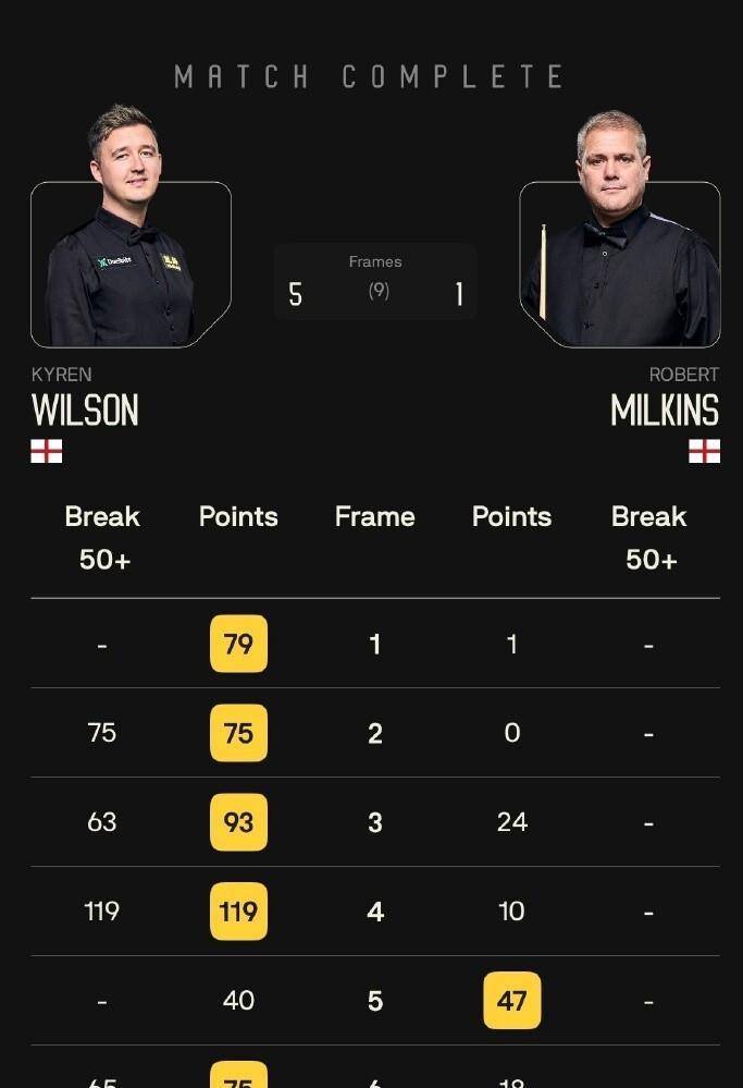 卫冕冠军凯伦·威尔逊倒是稳得一批。 他刚拿了大奖赛冠军,手感热得发烫,打米尔金斯就像练球似的,单杆119分、75分、65分哐哐砸,4-0碾压开局,最后5-1轻松晋级。 赛后他还感慨,这次是和他爸一起来的柏林,说老爹的支持是他职业生涯的“隐形支柱”。